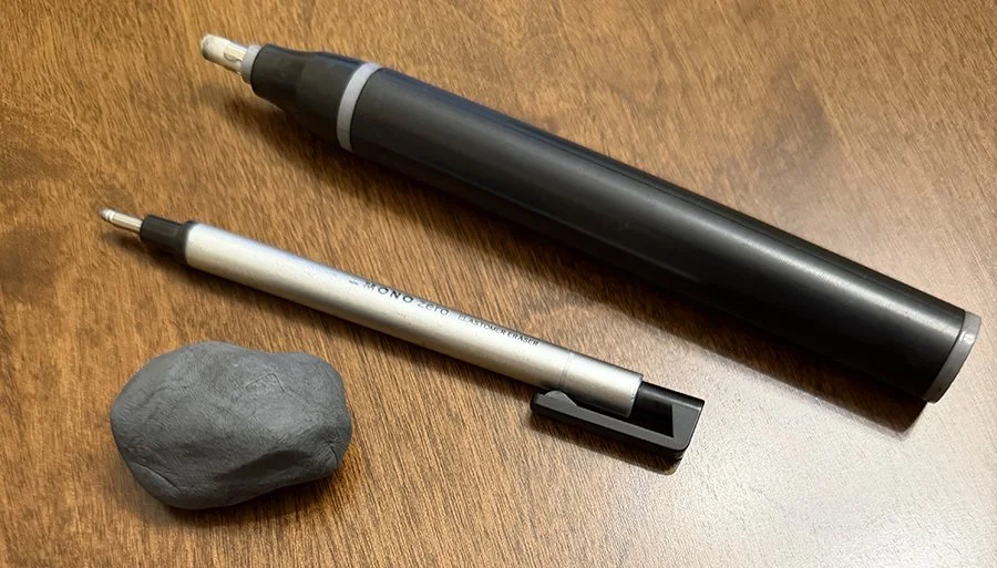 Left to right: kneaded eraser, retractable eraser, and rechargeable eraser